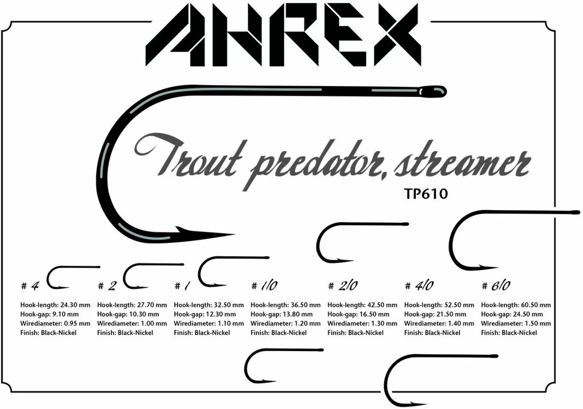 Excellent as a leading/front hook for modern articulated streamers. Stinger/Aberdeen hybrid bend. Strong wire. Big hook gap aids tracking and hook up percentage on bulky modern streamers, deer hair and mouse pattern designs.