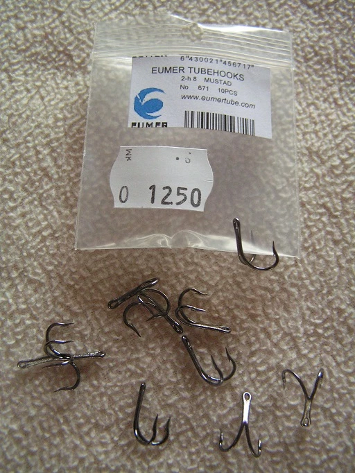 Eumerin vahvalankaiset, 2-haaraiset putkiperhokoukut, valmistaja Mustad. Koko:8, pussissa 10kpl koukkuja.