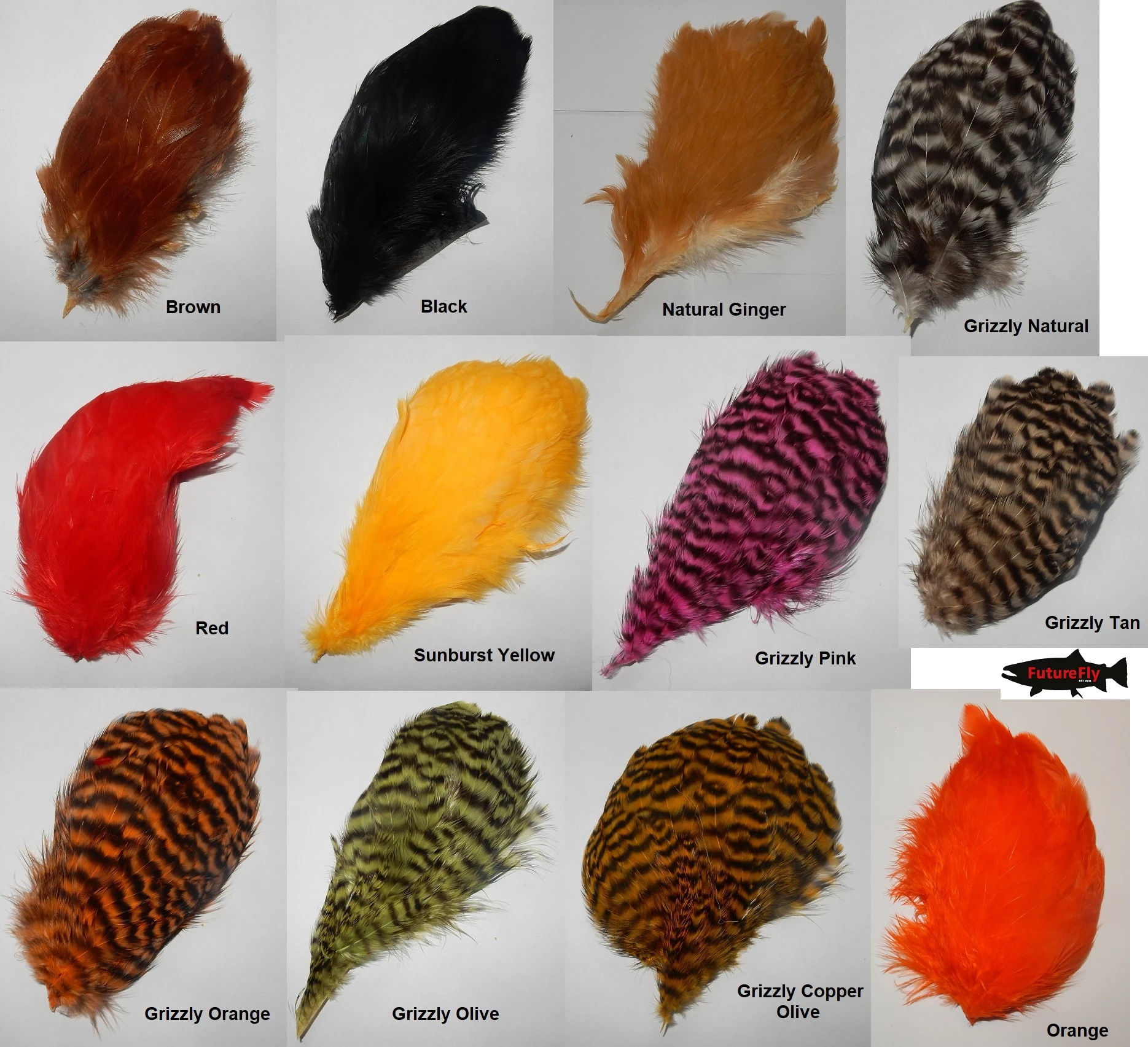 Future Fly Short Rooster -höyhenet ovat reunaosia Future Flyn isoista kukonniskoista. Todella hienoja, pehmeitä höyheniä, täydellisiä etuhäkilöiksi. Palaset erikokoisia, sekä pientä värieroa voi olla. Saatavilla 12 eriväristä palasta.