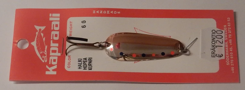 Onni Kapraalin valmistama mahtava lohi-taimen lusikka koviin koitoksiin, paino:6grammaa.