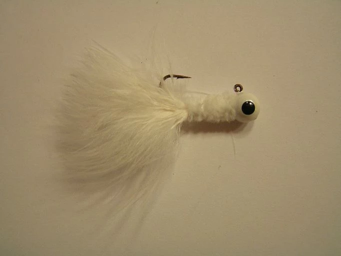 Valkoinen jigipää leech, valkoisella chenille rungolla ja valkoisella marabou-pyrstöllä. Paino:2.5g.