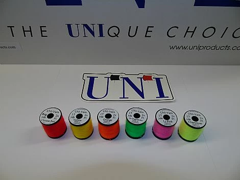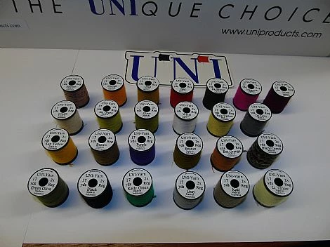 UNI-Yarn is a standard, 2-strand, twisted, acrylic fly tying yarn, spooled instead of carded for convenience and to reduce wastage. UNI-Yarn comes in twenty-six colours: Black, Black/Camel,Burnt Orange, Brown, Bronze, Cream, Gold, Olive Green, Grey, Insect Green, Kelly Green, Khaki, Dark Brown, Dark Grey, Light Yellow, Magenta, Olive, Orange, Purple, Pale Yellow, Red, Salmon, Sand, Sun Yellow, White, Wine.